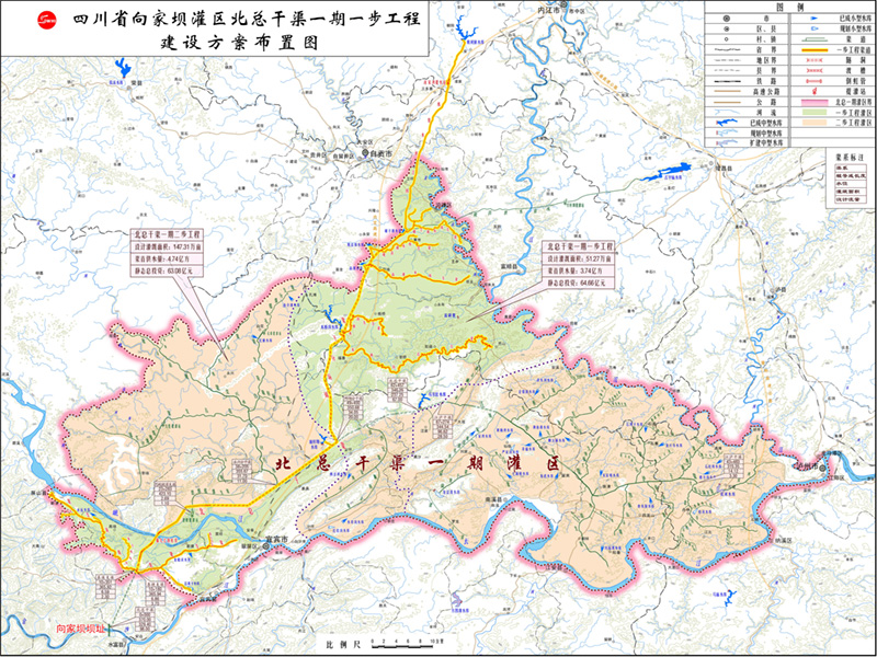 向家坝灌区北总干渠一期工程2014年列入国务院172项节水供水重大水利工程。工程涉及四川省宜宾、泸州、自贡和内江四市,设计灌溉面积198.57万亩,多年平均供水量8.47亿立方米,其中农业灌溉及农村供水5.21亿立方米,城镇生活及工业供水3.26亿立方米。