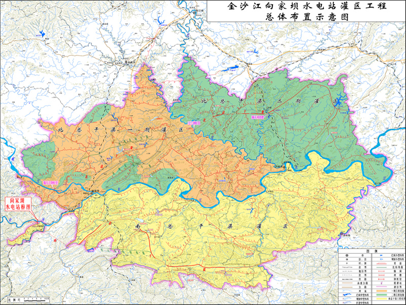 向家坝水电站灌溉工程位于四川盆地西南部和云南省东北部的低山丘陵区,毗邻重庆市。灌区开发任务以灌溉为主,兼顾城乡生活、工业供水。灌区工程由取水枢纽、输水及灌溉渠系、囤蓄水库、提水工程及田间工程五大部分组成。取水枢纽与向家坝水电站大坝相结合,位于两岸非溢流坝段,设计取水位 370.00m。以长江为界,分为北总干渠和南总干渠。北总干渠渠首设计流量为 98m3/s,南总干渠渠首设计流量为38.0m3/s。